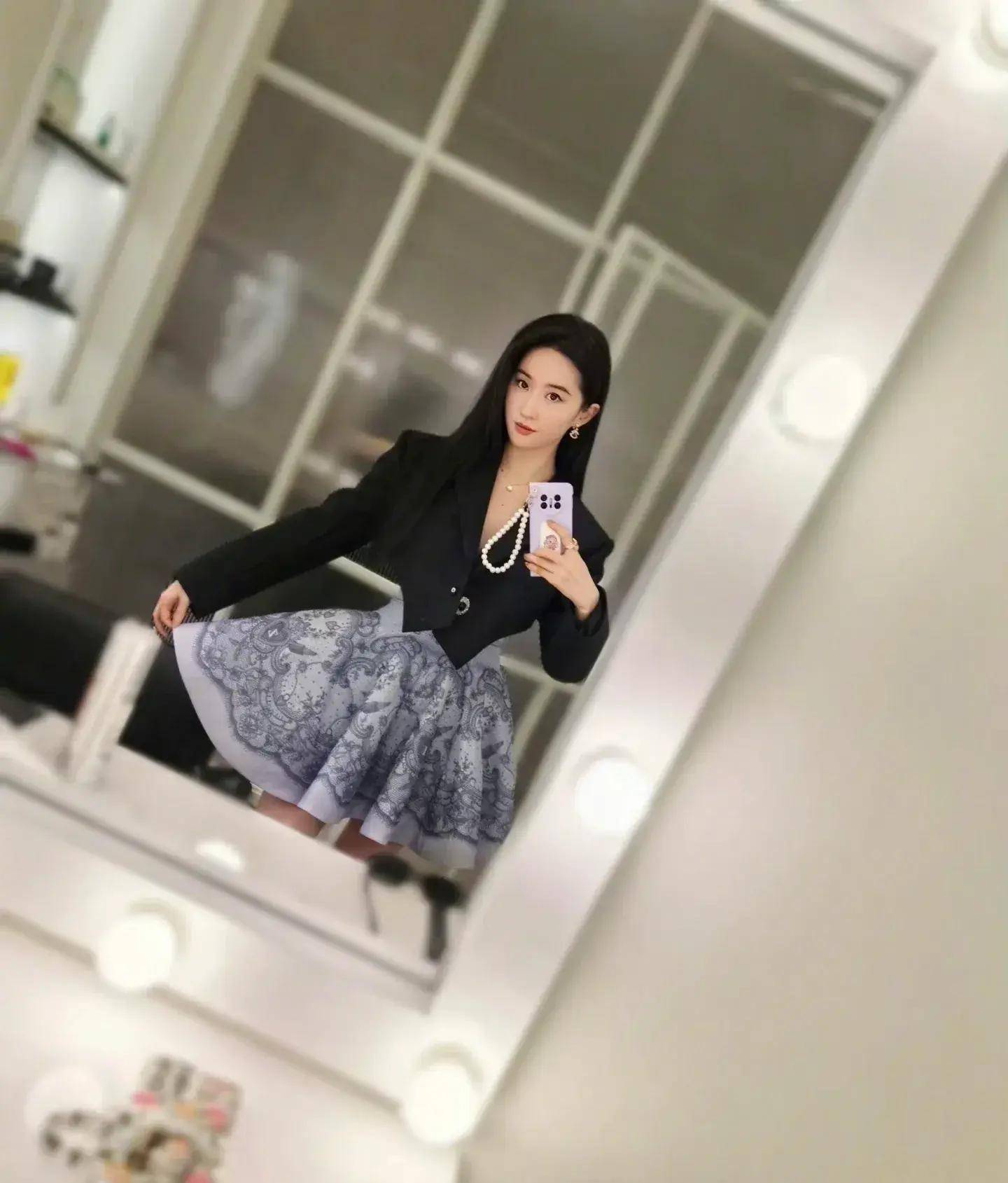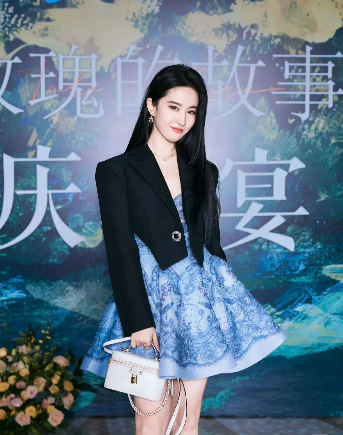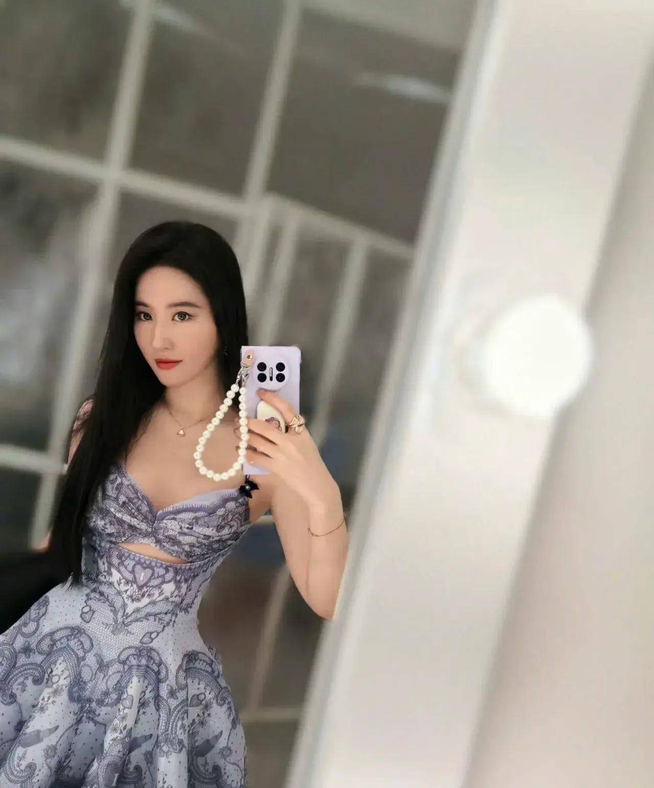 你说刘亦菲平时不咋爱自拍,但这么开心的场合,她也忍不住晒了两张对镜自拍的美照。照片里的她,穿着蓝色吊带蓬蓬裙,外搭一件黑色短款修身外套,那造型,性感又迷人,简直就是黄亦玫本玫啊!
