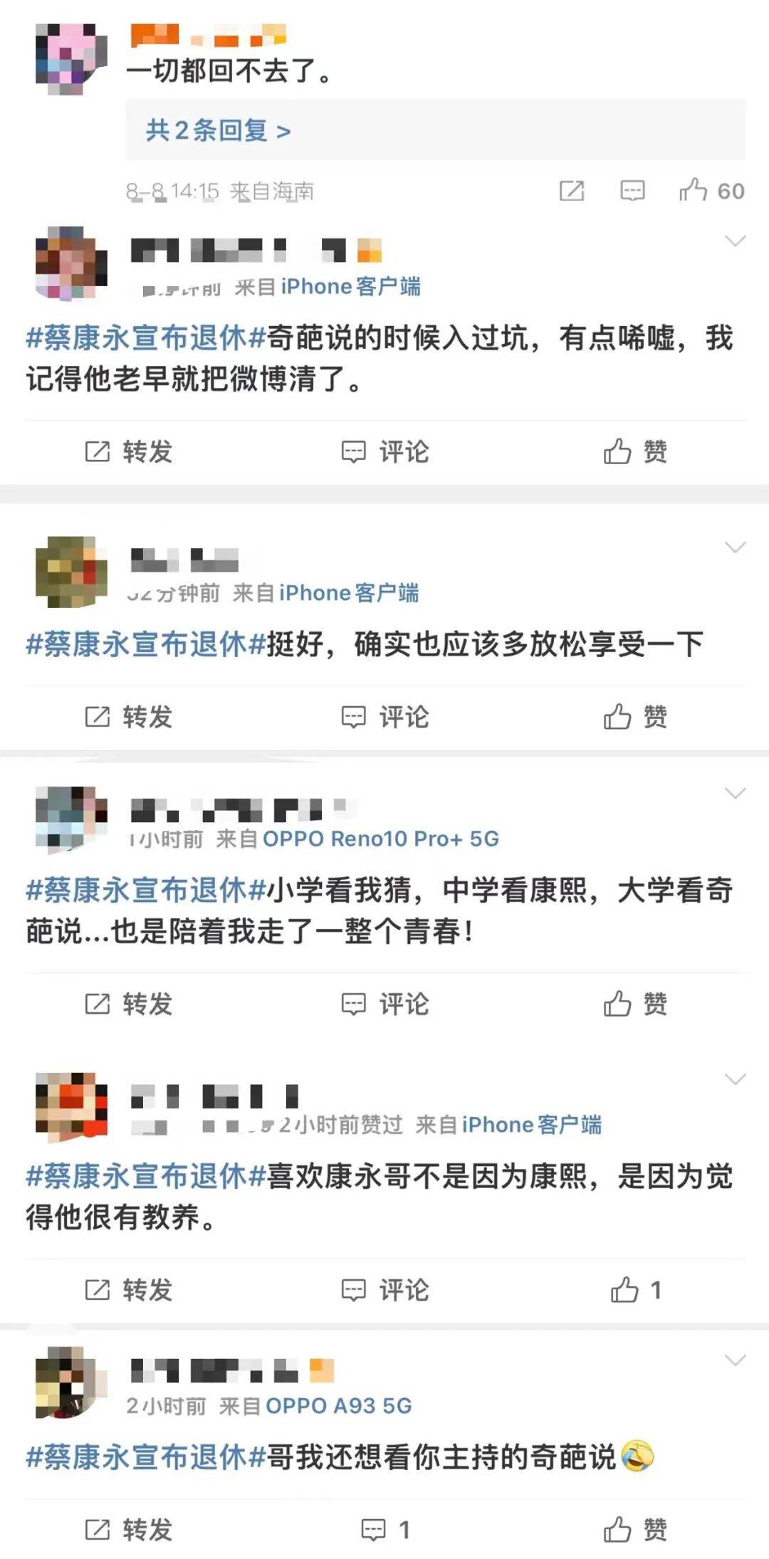 蔡康永近日在采访中宣布退休,“不想做,我已经做够了。”他说:“我觉得自己现在无法主持这类节目,当年我和熙娣、来宾在节目上玩得自由自在,但现在节目都要求内容正确,乱开玩笑的节目是无法生存,且要维持平衡,对我们两人来说太累了。”