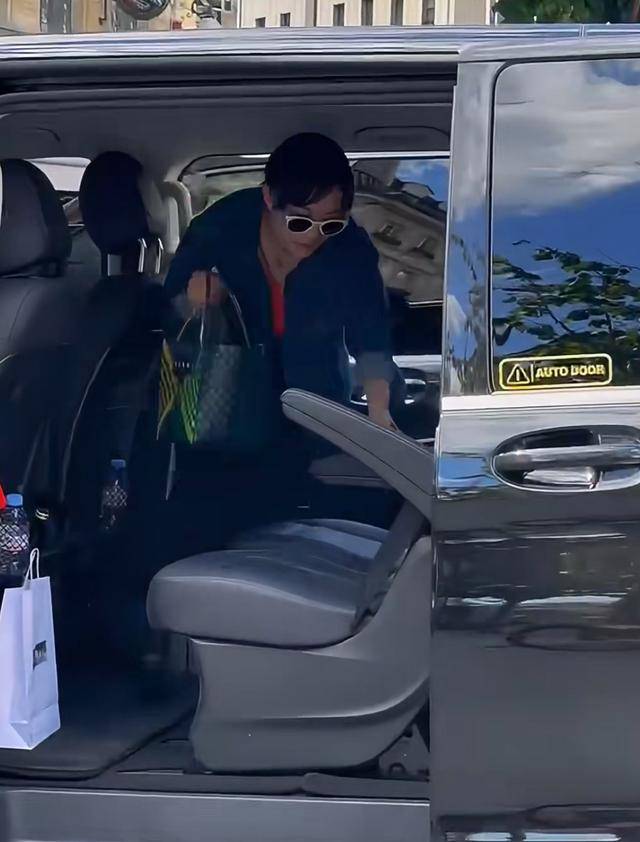 等等则从另一侧上车。12岁的等等也穿着一身黑色,白色外套绑在肩头,走路带风,颜值和气质都十分出众。