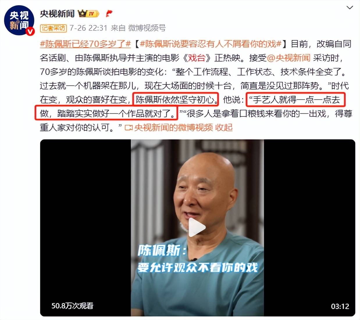 拍电影《戏台》时,资本觉得这玩意儿不赚钱,纷纷跑路,陈佩斯没妥协,他宁可慢,宁可难,也“不会为了世道和市场去做改变”。