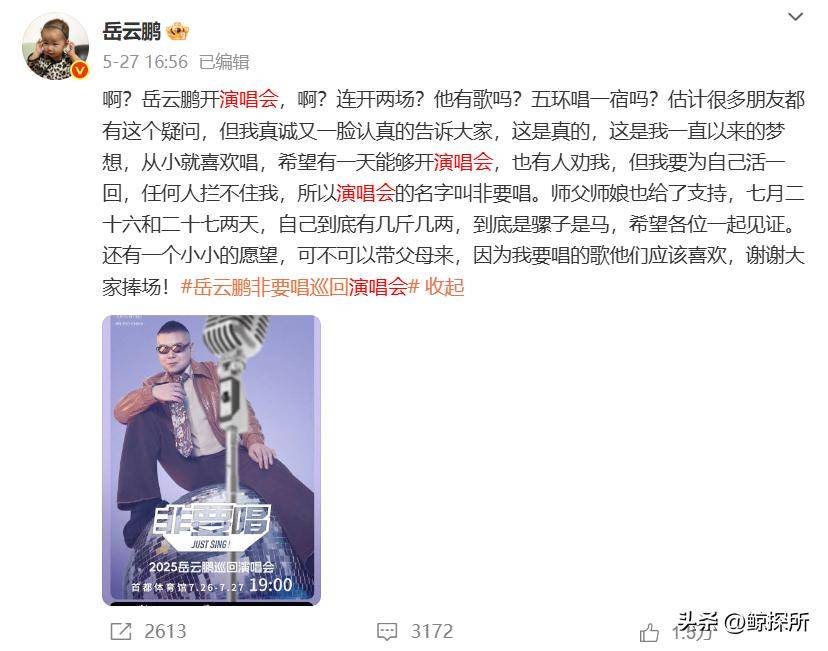 可是,除了涉足影视剧之外, 今年的岳云鹏,还官宣了自己的演唱会。