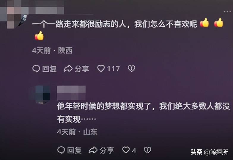 有人说,一个一路走来都非常励志的人,怎么能不喜欢呢?而且他年轻时候的梦想都实现了,可绝大多数人的梦想都是没有实现的。