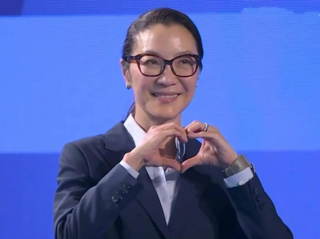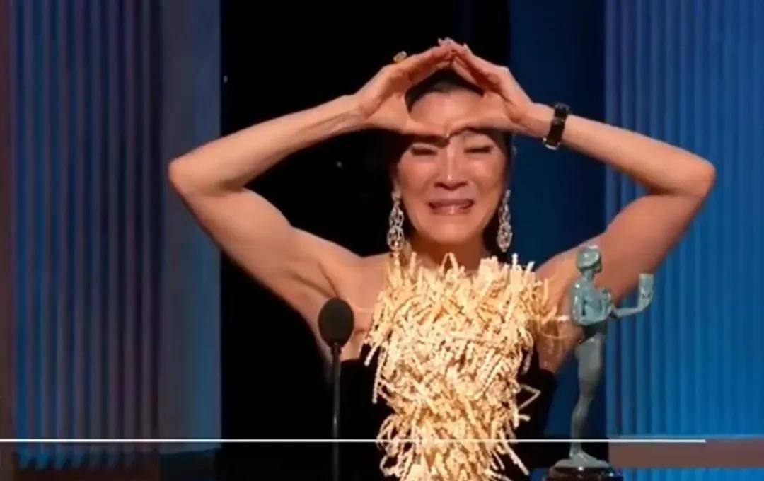 更令人疑惑的是,杨紫琼获评美国演员工会奖最佳女主角上台领奖时,非常刻意地做了一个奇怪的举动,用双手在头顶摆了一个像三角形的手势。(肯定不是比心吧?)