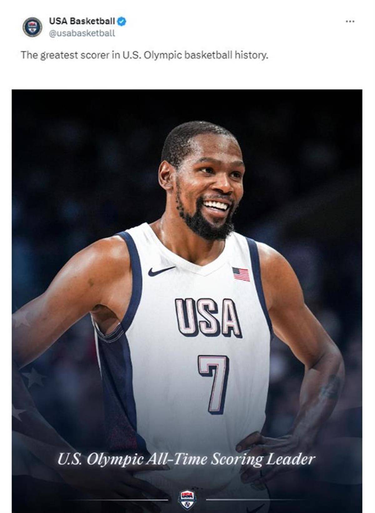 美国男篮发文祝贺杜兰特成为奥运得分王(图源网络)