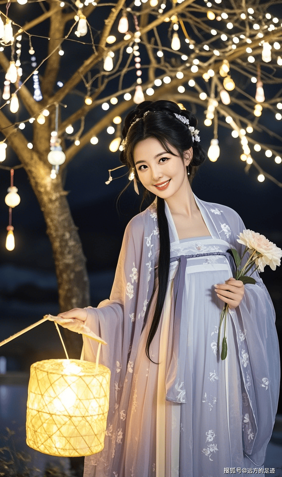 在七夕节的夜晚,身着淡紫色汉服,手持花灯