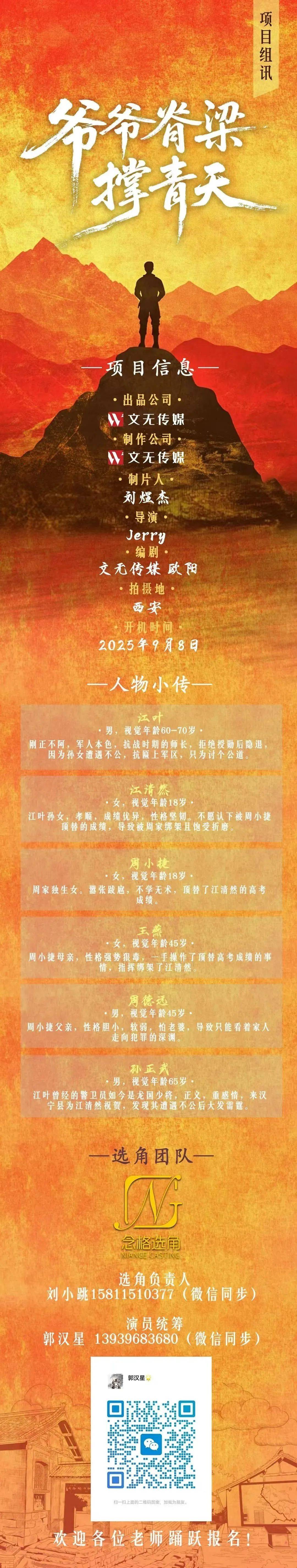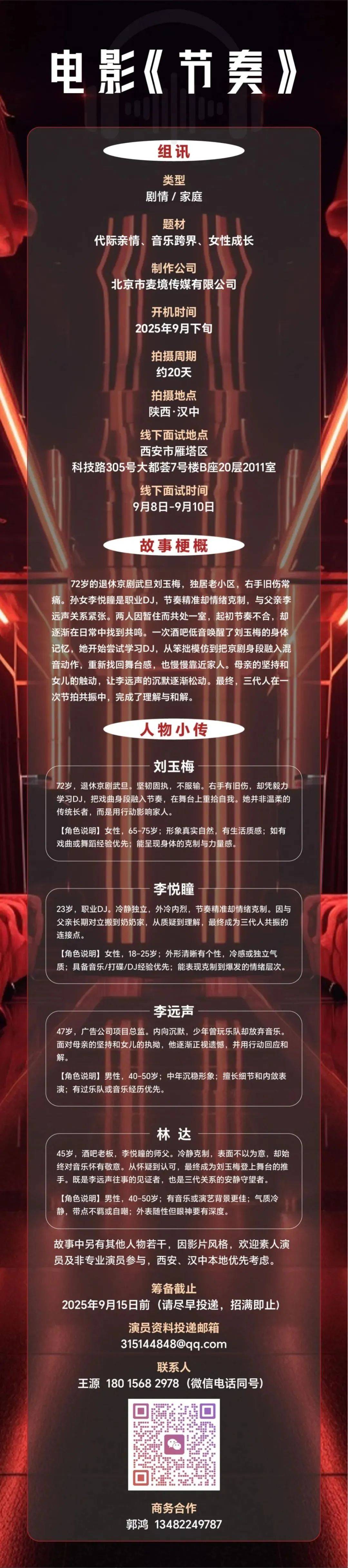 免责声明:戏客Seeker公众号(“本平台”)中全网组讯的信息、内容(“组讯信息”,包括但不限于影视项目名称、项目介绍信息、出品公司信息、导演信息、选角团队信息、拍摄相关信息、联系方式等)均来源于内容信息相关方提供或互联网公开信息。本平台不对组讯信息的真实性、准确性、完整性、及时性、关联性、适用性及安全性提供任何明示或默示的担保。请您谨慎参考或使用组讯信息,并确保您的人身、财产安全,本平台不对您使用或参考组讯信息而造成的后果承担任何责任。