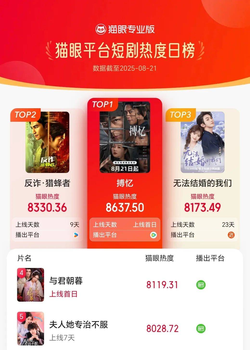 悬疑短剧《搏忆》于8月21日开播,凭借其演员阵容和颇具特色的内容设定,上线首日即登顶猫眼短剧热度榜,腾讯视频悬疑剧榜第二名。