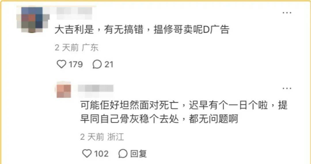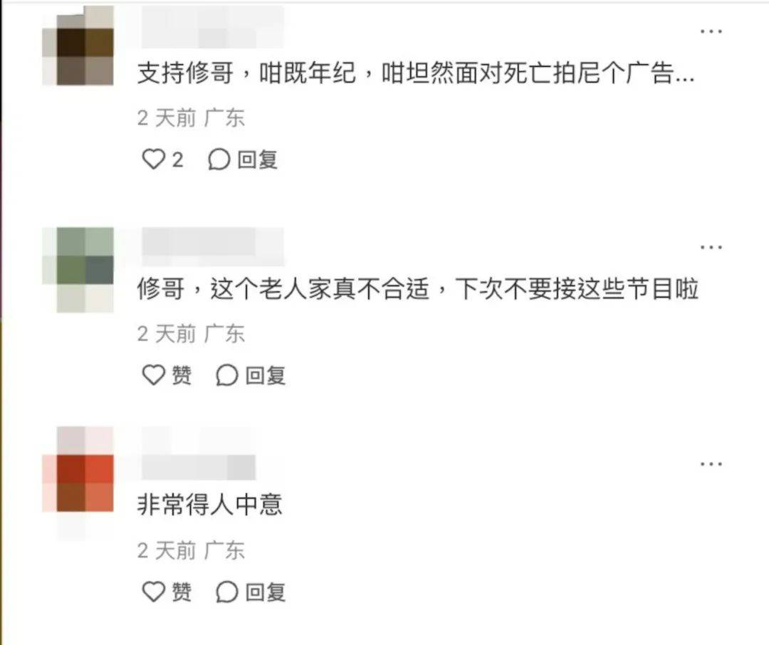 但爱吃瓜的网友也出现不同声音。有人认为修哥此举实属不妥。他们认为这种广告很晦气,还建议修哥不要再接拍这类广告,毕竟已经一把年纪,不怕一万就怕万一。
