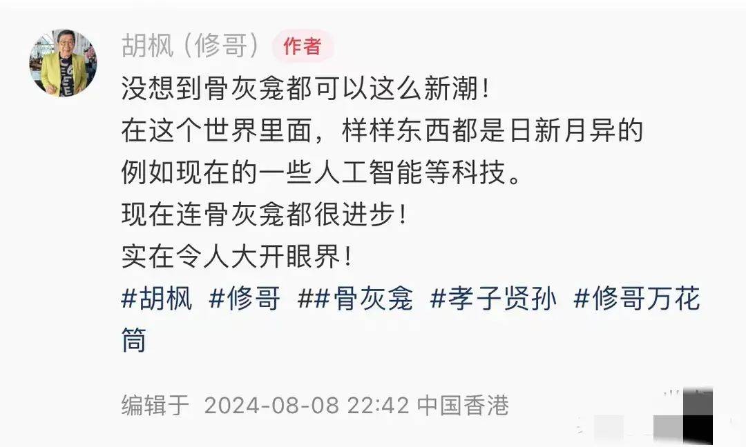 修哥一直都是幽默豁达的人。回首大半生,对所有事都淡然。最近他更打破传统思想,在社交平台分享他为骨灰龛卖广告的片段。在一般人的眼中,这种广告一般明星是不会接的,毕竟很多人都认为是很晦气。
