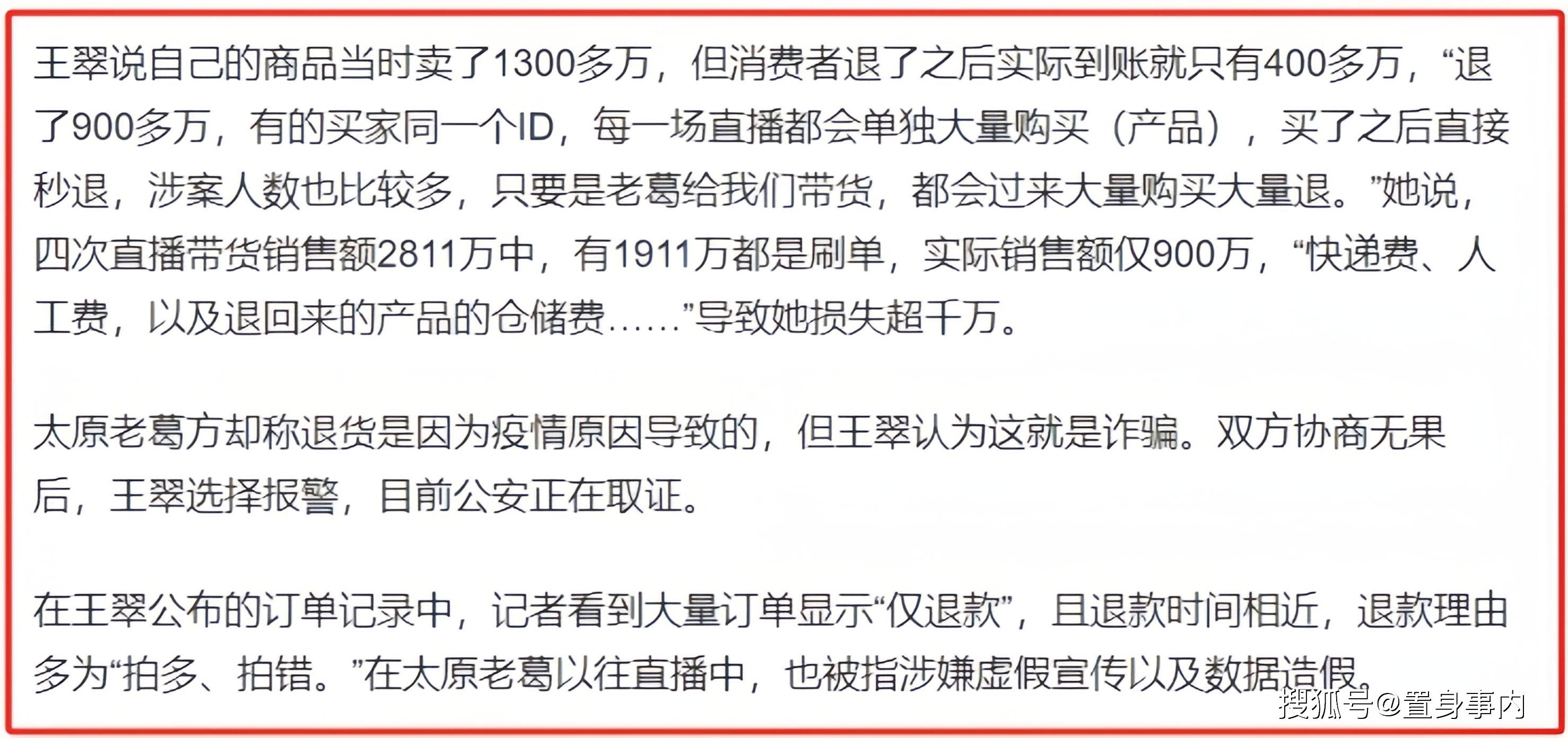 随后,商家认为“太原老葛”的直播带货过程中,存在严重的数据造假和刷单行为。但“太原老葛”觉得是“口罩原因”导致退货,双方互相扯皮,协商无果后商家选择报案。