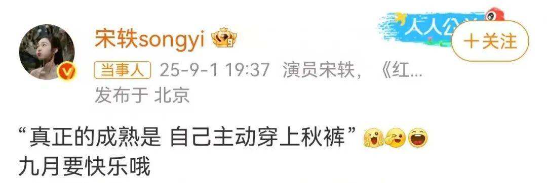 9月1日晚,宋轶在个人社交平台发视频,并配文:真正的成熟是自己主动穿上秋裤。
