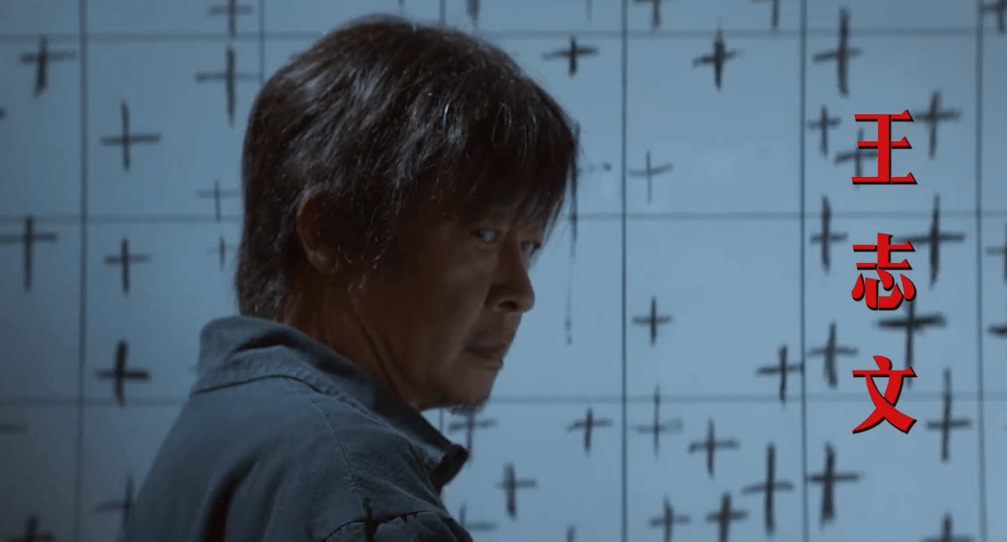 王志文饰演的角色,背景布满类似十字的标记,营造出压抑、充满创伤感的氛围。