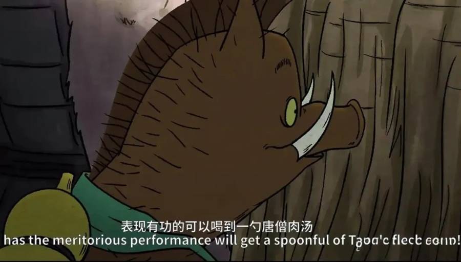 相比母亲,小猪妖的父亲揭示出了命运更骨感的一面。这个已经因为酗酒瘫痪在床的老妖,在听说儿子正假装唐僧师徒西天取经时眼中竟燃起炽热、癫狂的火焰。