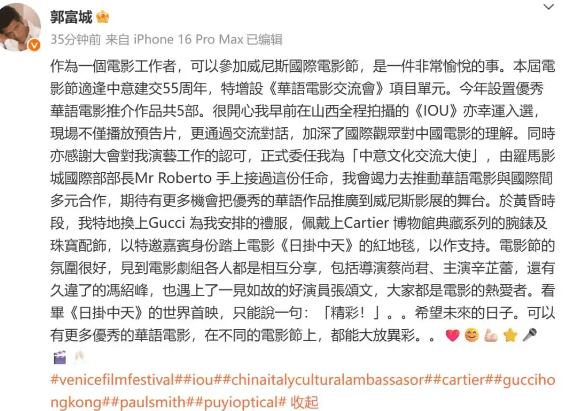他此番身份更是多了一层重要的意义,他被正式委任为“中意文化交流大使”。是罗马影城国际部部长Mr Roberto亲自授予的,足见国际影坛对郭富城个人认可。