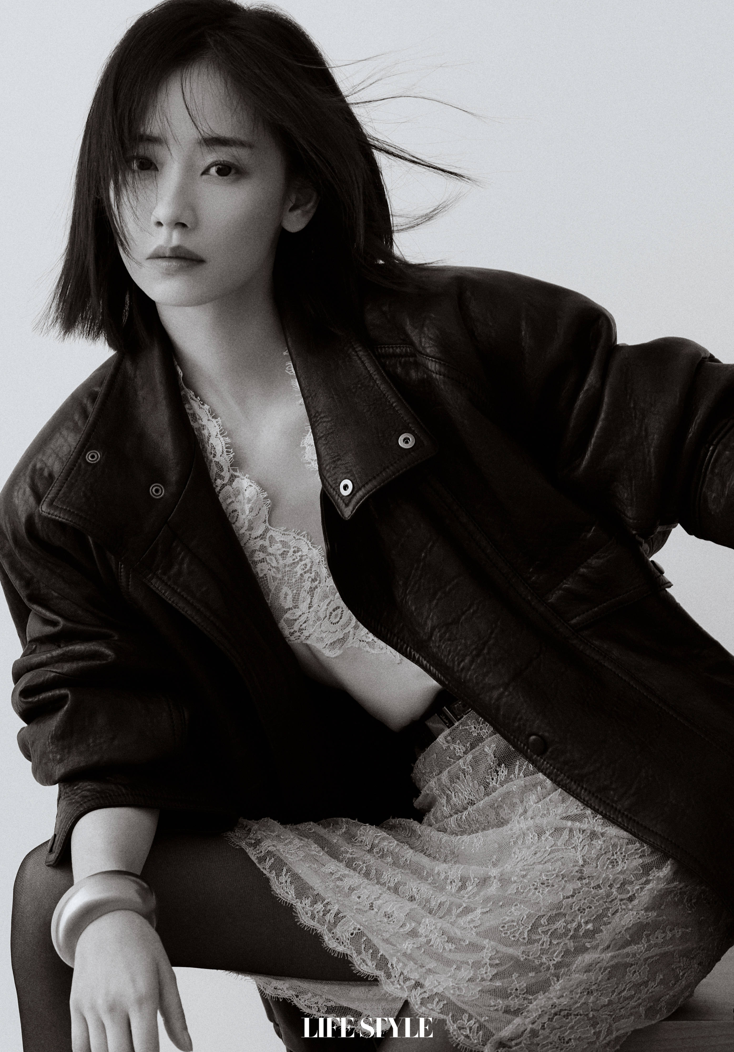 刘雅瑟穿黑色皮质外套搭配蕾丝连衣裙,反差感十足。