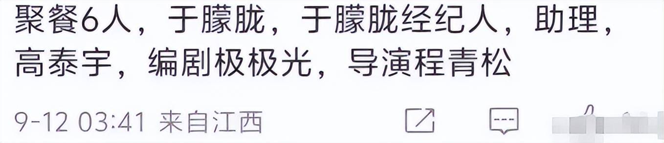 因此,网友将矛头对准了疑似参与聚餐的几位有人,网传当晚聚餐的共有六位,分别是于朦胧、于朦胧经纪人和助理、高泰宇、编剧极光光及程青松。
