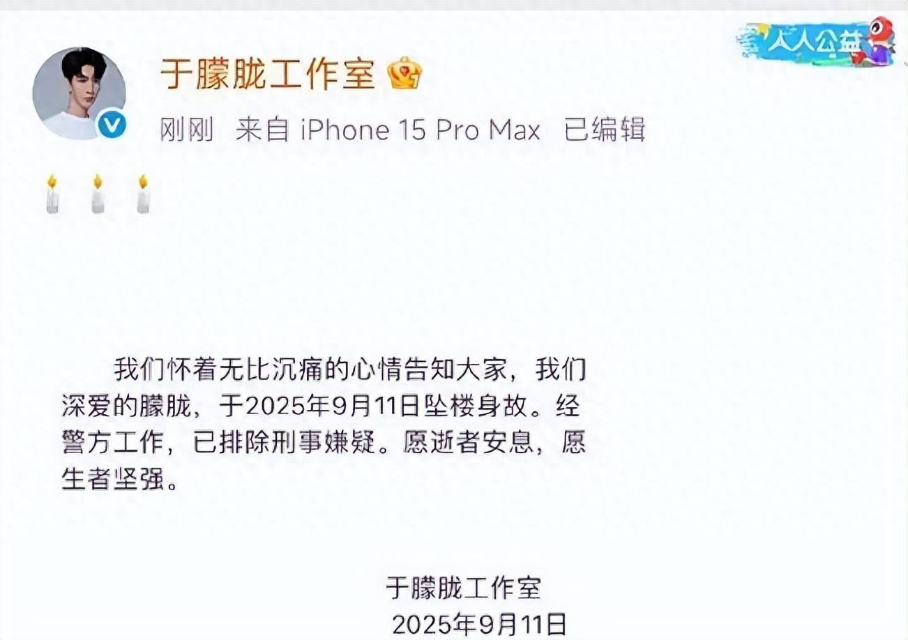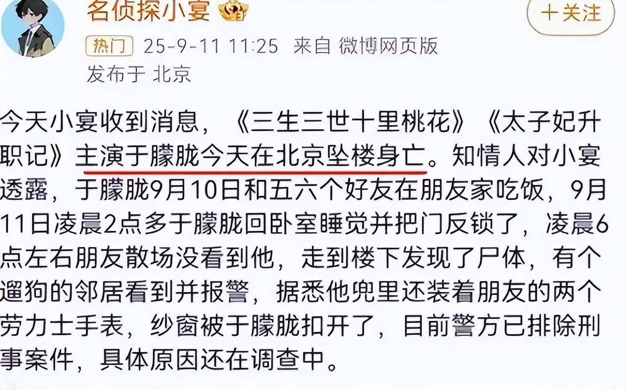 于朦胧确实离世一天后,有关他生前最后聚会的细节仍在持续发酵,虽已排除刑事嫌疑,但工作室也未说明于朦胧坠楼究竟是意外还是轻生。