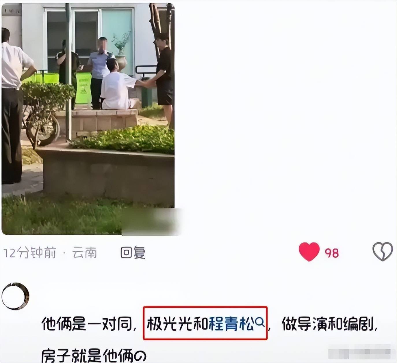 随着越来越多的线索和指引,大家将目光聚集在现场两名男子身上,他们分别是导演程青松和编剧极光光,相信很多人都刷到过这张照片,警员站在一旁。