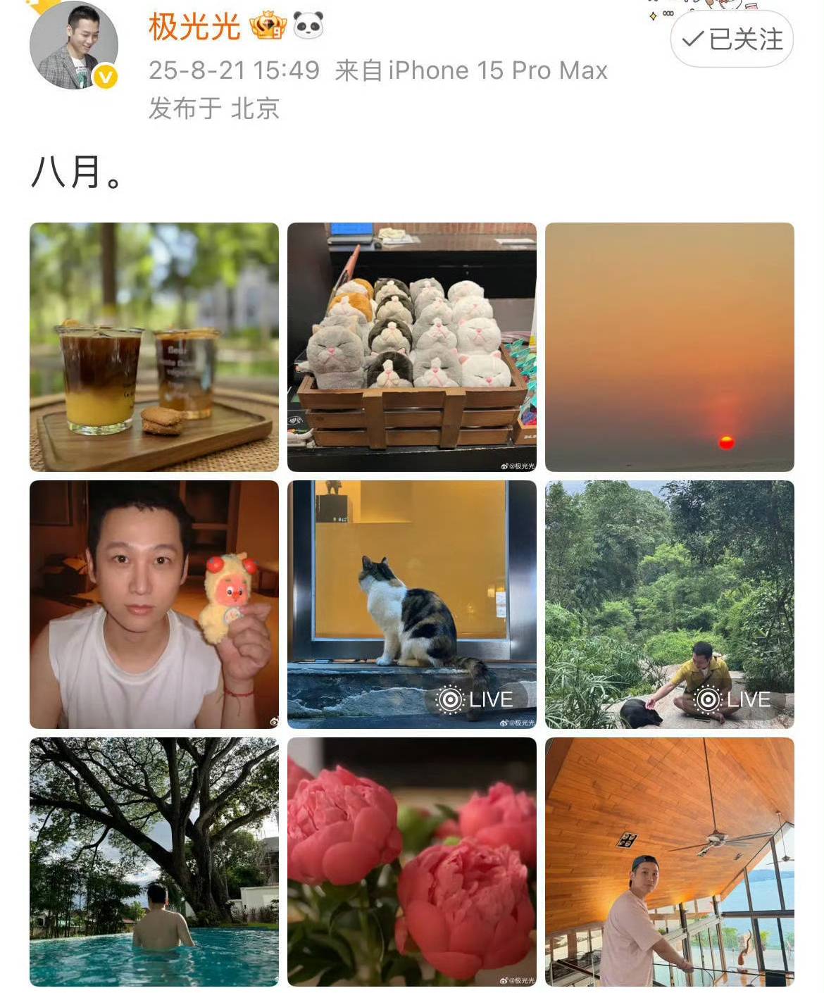 他的社交平台最新一条动态还停留在8月24日,而在8月21日那天,极光光曾更新了四张自拍照,不管是模样还是发型,都和对着镜头坐的白色上衣男子非常相像。