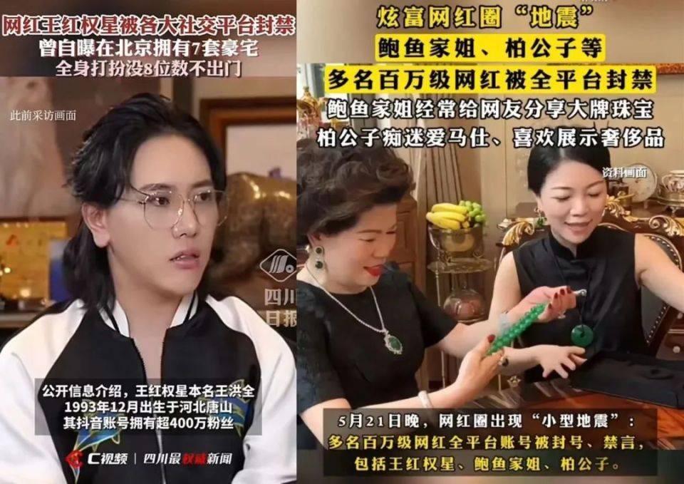 东施效颦者则容易滑向“炫富”的一边,而这无论从政策还是民意上看,都是不可逾越的红线。自称“国际知名网红”的王红权星,以及他的同类博主鲍鱼家姐、柏公子,在今年六月均被全平台封禁。此前,他们频繁向外界展示自己奢华的生活,在抖音一个平台吸引到数百万粉丝。在官方通报中,王红权星涉嫌在视频和直播里夸大其词、虚假宣传,利用粉丝进行商业欺诈。