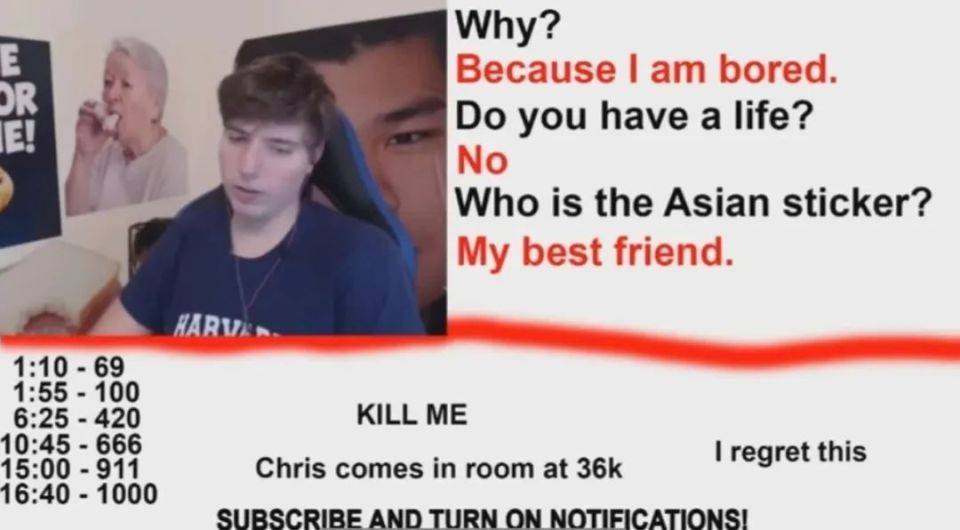 他起码自2016年就开始在推特上与一位叫shadman的画师多次互动,并转发后者的作品。而这位画师是一位臭名昭著的非法内容制作者,其作品广泛涉及强奸幼女和幼女猥亵等内容,Kris还曾把shadman的一幅画直接挂在宿舍,在视频中堂而皇之地出镜。更关键的是,Kris对一位当时还是未成年的网友,在聊天时使用过大量性骚扰性质的词句的丑闻也被曝光出来。以此为起点,此后,关于Mr.Beast的争议和丑闻逐渐在舆论场上被引爆。