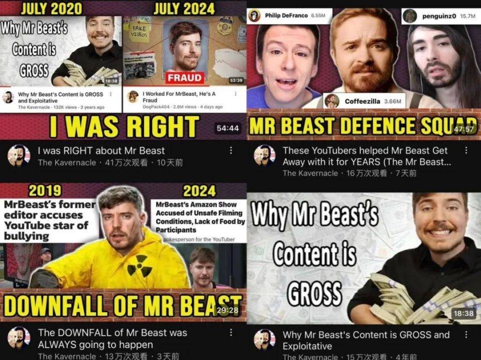 作为YouTube最头部的内容制作者,Mr.Beast开启的视频创作思路和制作范式产生了深远的影响,他的模仿者层出不穷,其中不乏中文互联网上的自媒体从业者,而当榜样的光环逐渐褪去,这些追随者们可能要开始寻找新的明灯了。