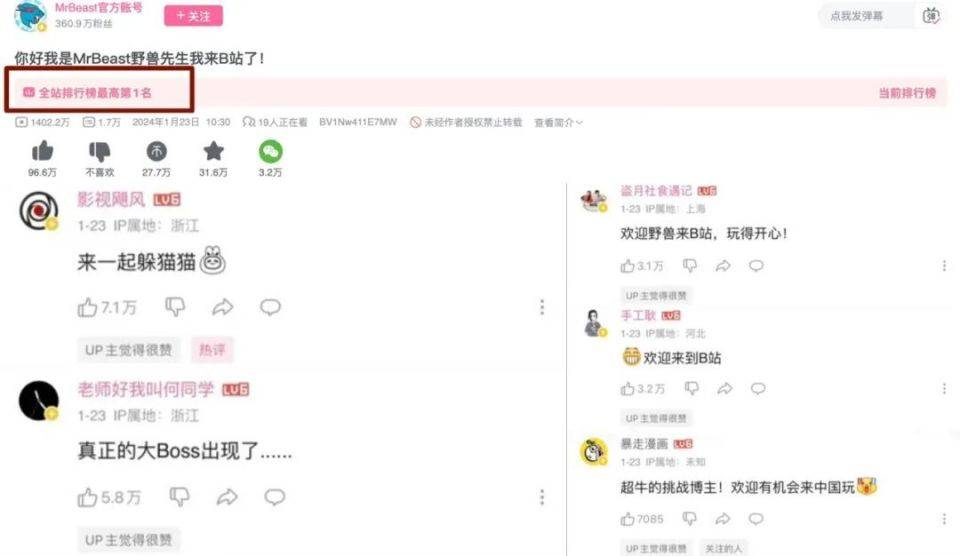 今年1月23日,Mr.Beast携官方团队入驻B站,官宣视频点击量迅速突破千万大关。影视飓风、何同学、盗月社和手工耿等B站UP主在评论区排队迎接,给一些此前对其并不了解的国内用户带来了切实的“Mr.Beast”震撼。