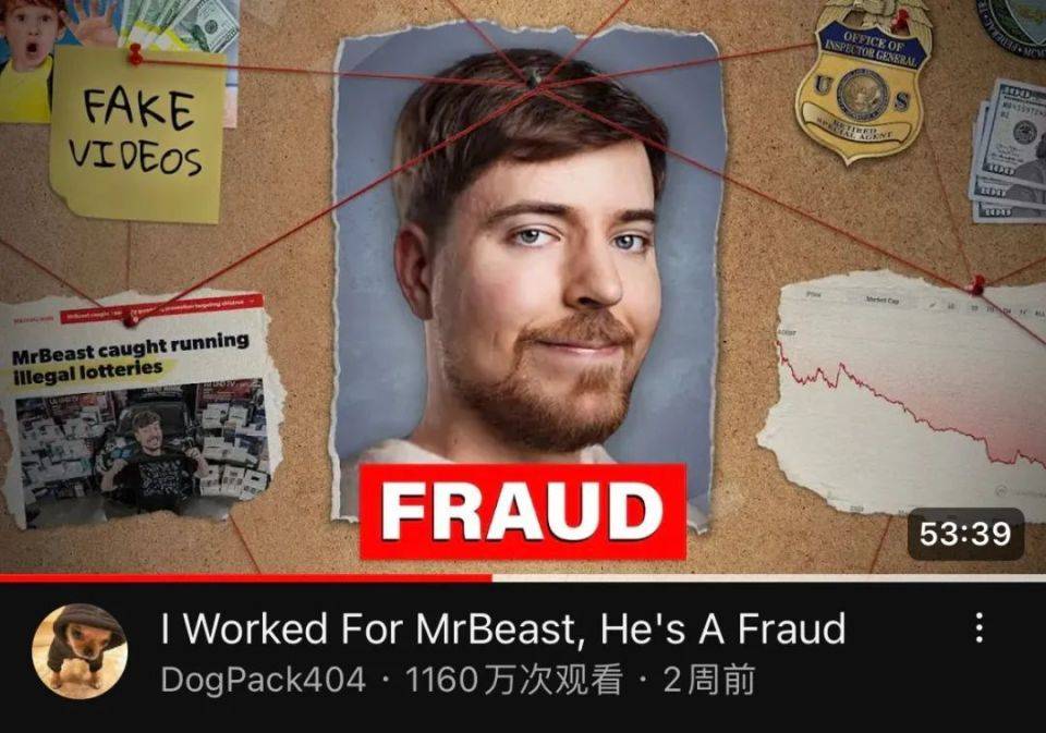 7月25日,一名名为“DogPack404”的博主发布了一则《我曾为MrBeast工作,他是个骗子》的视频。在接近一个小时的时长里,这位博主主要提出了以下几点指控:其一是操纵节目参与者构成和走向,使团队员工和其亲友更容易获得巨额奖金,Mr.Beast声称自己是随机从订阅者中挑选参赛者,但在一期视频里同时出现了自家的招聘经理和唐纳森的女友;其二是在节目中标榜一切真实,却存在脚本以满足戏剧冲突和使用了大量特效辅助拍摄以节省成本,比如用粉碎机毁灭兰博基尼和火车冲入深坑的场景都是电脑特效合成;其三,Mr.Beast和亚马逊流媒体合作的新节目中管理不善,使参与者待遇很差且得不到食物和药物,并且有多人在录制途中受伤等等。
