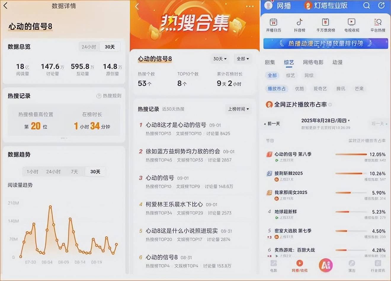 老牌恋爱综艺《心动的信号》第八季(简称《心动8》)于8月4日重磅回归,首播当日便创下2.1亿次的惊人播放量。随着节目推进,相关话题在微博热搜榜上频频亮相,累计阅读量突破20亿大关。至第三期播出时,该节目以12%的市场占有率问鼎综艺排行榜。