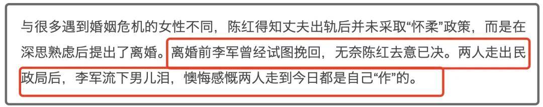 还记得我们之前提到的那个犯罪记录吗,就是因为这件事,导致了李军公司出了问题,进而后续衍生的一系列财产纠纷。值得注意的是,当年离婚前李军还试图挽留,但陈红去意已决,离婚后走出民政局时,李军痛哭流涕,说二人走到这一地步都是自己作的。