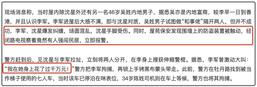 那么问题来了,李军有什么理由怀疑沈星呢?原来当时李军已经婚内出轨沈星了,当时是因为去沈星香港豪宅登门求见吃闭门羹,随后李军召司机驾来七人车,踏上车顶翻越4米高屋苑围墙,爬入沈星位于一楼的寓所露台,再以伸缩警棍击碎玻璃潜入。