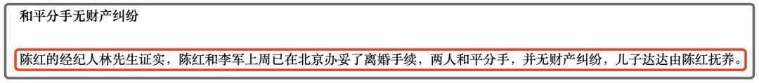 据悉,陈红与李军于2014年3月宣布离婚。当时陈红的经纪人还向媒体证实,二人是和平分手且没有财产纠纷。但2015年6月,李军公开指责陈红在离婚后伪造各种证件,非法霸占公司,侵占自己巨额资产,并廉价变卖公司资产,对李军进行造谣诽谤并欺骗合作伙伴,因经营无方,造成巨大损失。