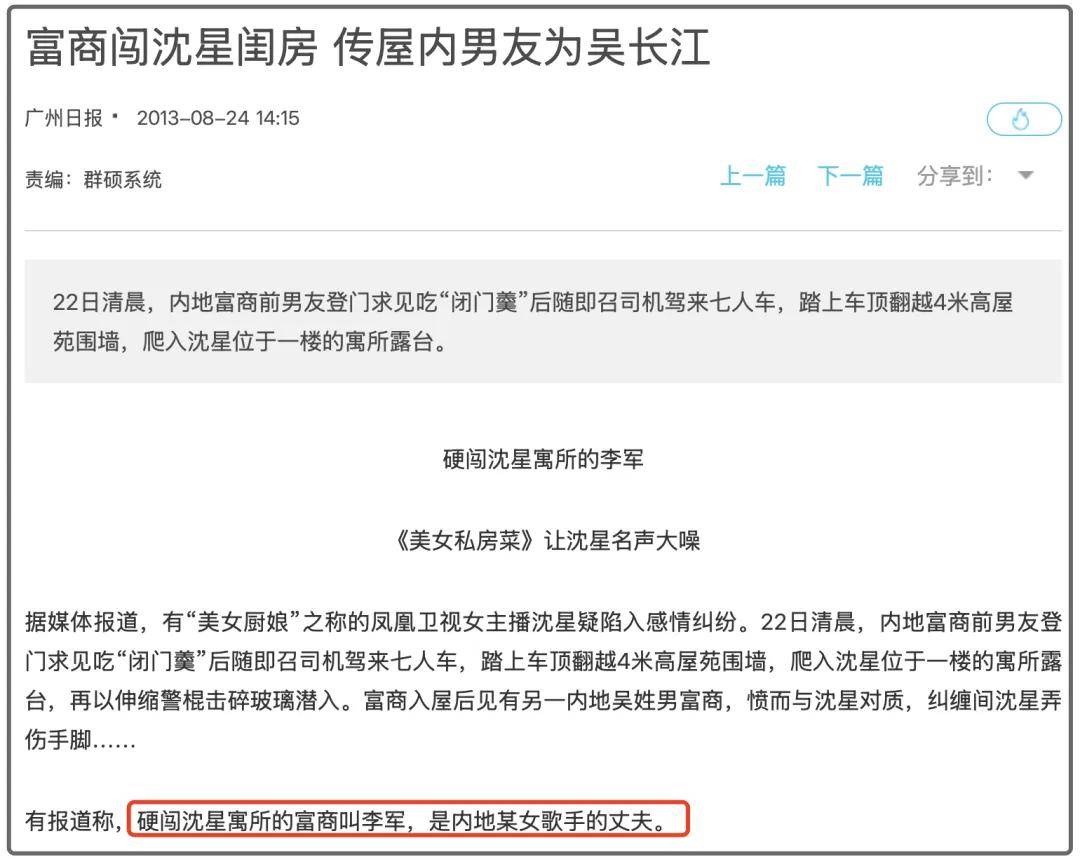 可到了2013年,一条《富商闯沈星闺房,传屋内男友为吴长江》的新闻引起轩然大波,后来经过证实,这位富商就是李军。至于为何闯沈星闺房,是因为李军怀疑沈星在屋内藏“第三者”偷腥。