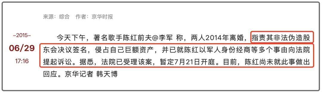 据媒体报道,近日歌手陈红前夫李军在京召开发布会,再度控诉陈红在离婚后非法控制他的公司,致使数十亿资产流失。要知道这段恩怨已经持续十年之久了,但谁都没想到,这段恩怨竟与当年李军出轨有关。