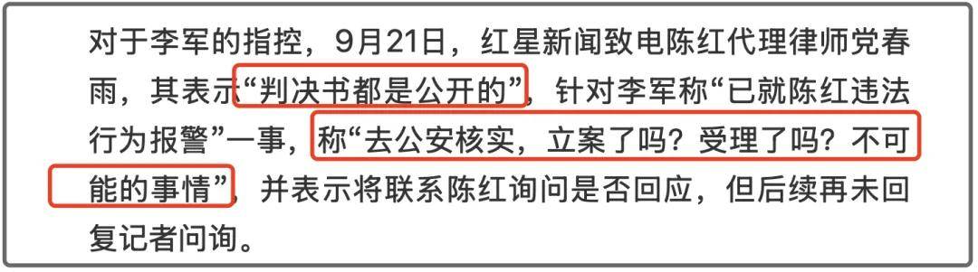 李军开完发布会后,有媒体联系了陈红的代理律师,针对李军所说陈红违法一事已经报警,律师很是无语,表示这都是不可能的事,而且有关于二人的财产纠纷,其实法院判决都已经公开了。