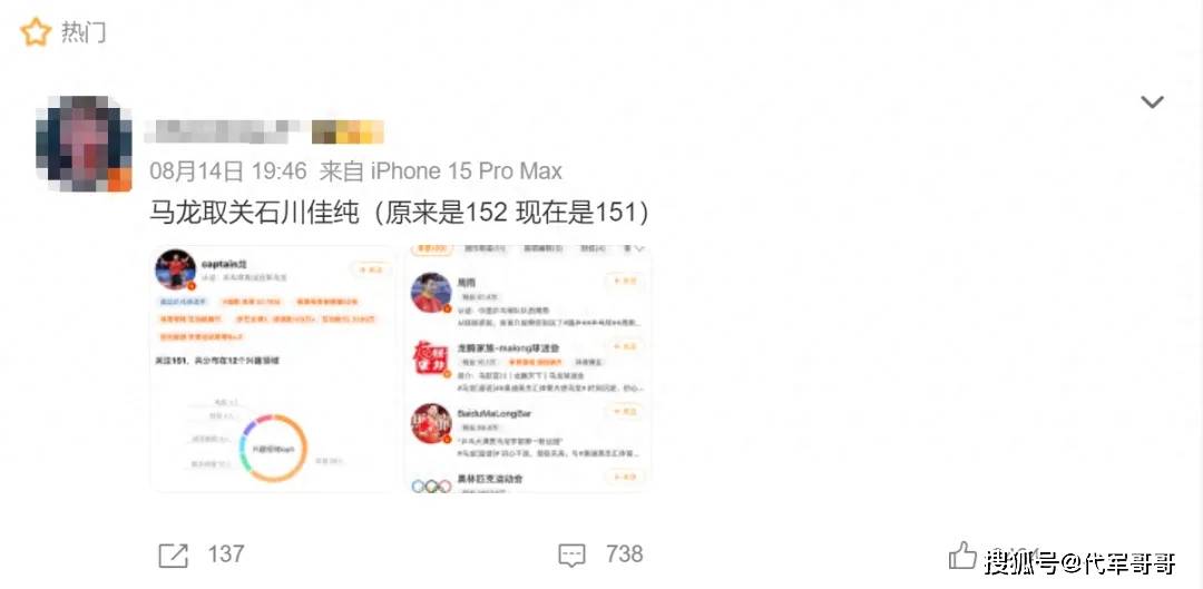 在石川佳纯参拜东乡神社的丑闻被曝光后,马龙立刻表明了态度。这位中国乒乓球队队长、中国奥运代表团旗手已经在第一时间取消了社媒对石川佳纯的关注。从此,二人将成为路人。