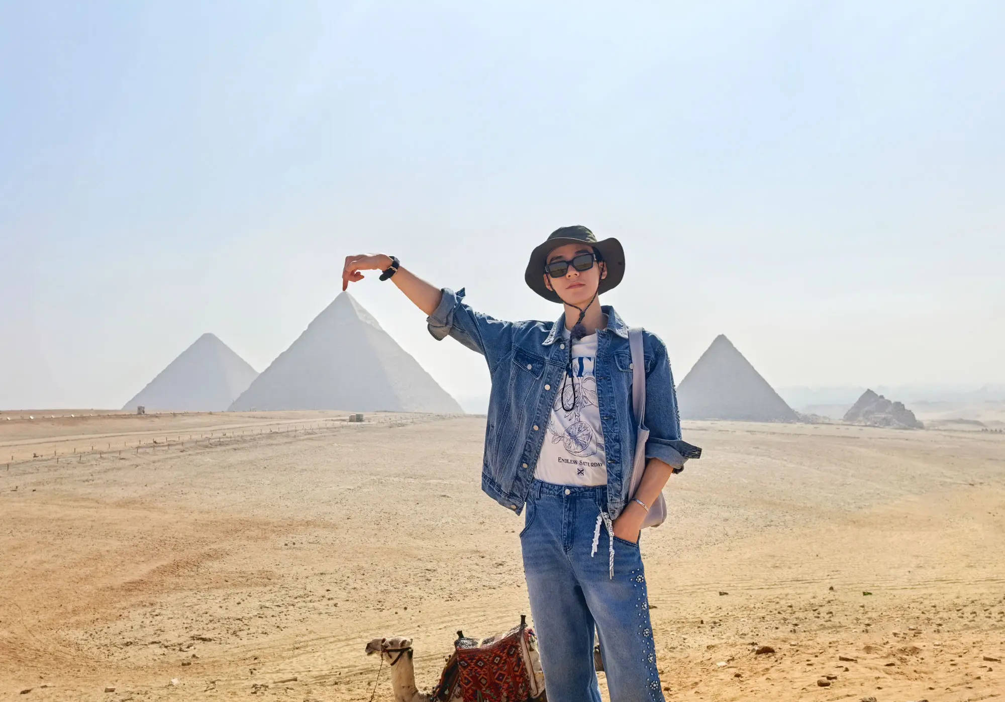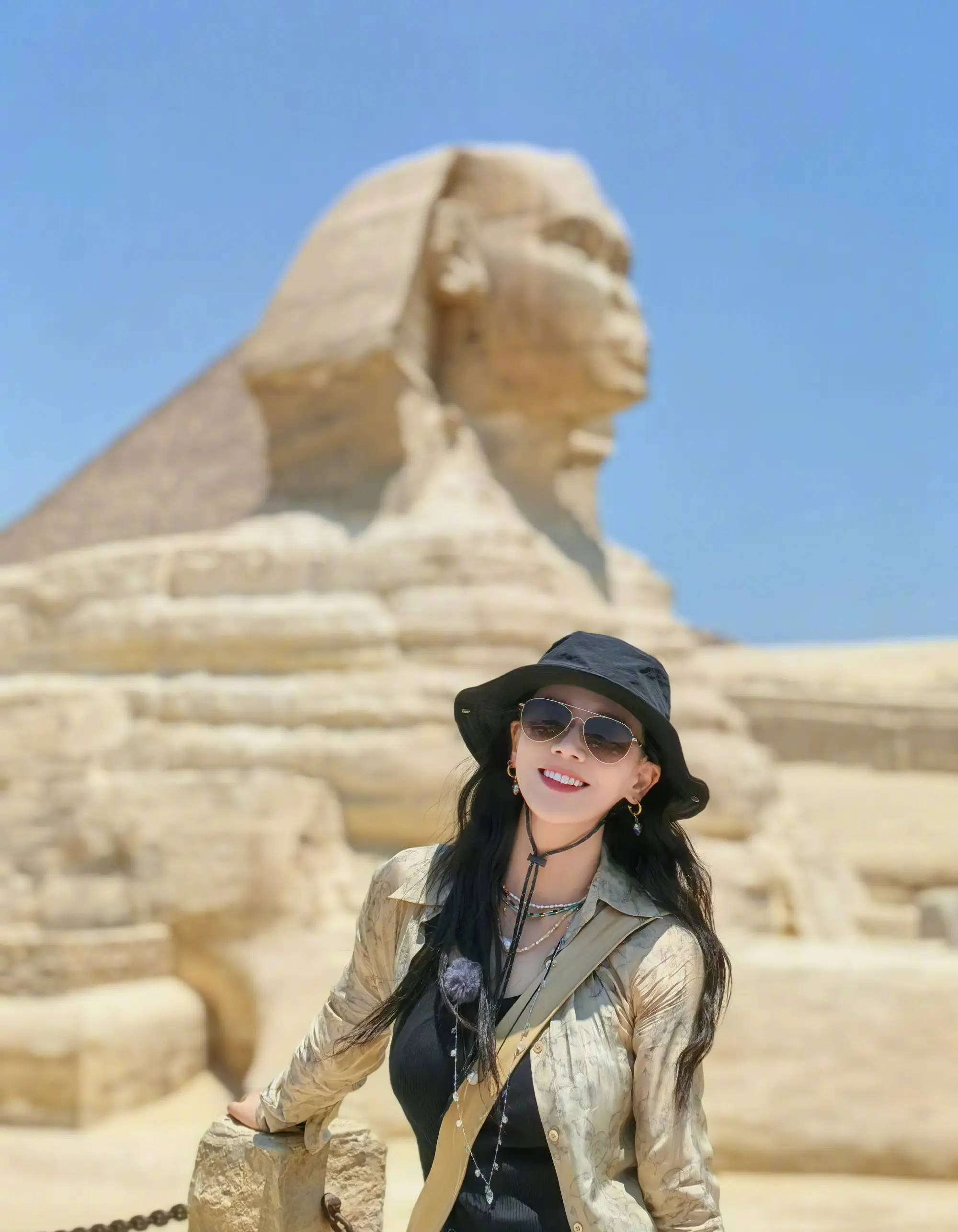 马思纯与狮身人面像合影,面露灿烂笑容。