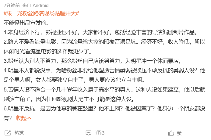 所以笑话三就来了,朱一龙粉丝隔天在另外一场路演里贴脸开大!