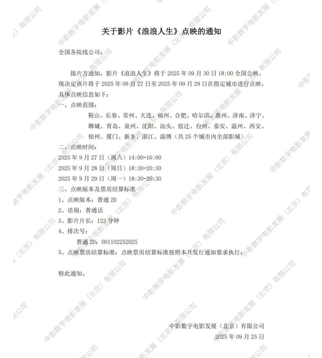 9月25日电影《浪浪人生》率先开启25城点映,点映时间为27至29日,点映范围集中在二三线城市——这一选择既避开了和一线城市头部影片的直接竞争,也瞄准了下沉市场的合家欢需求,试图通过提前释放喜剧类型片的轻松氛围,积累前期口碑。
