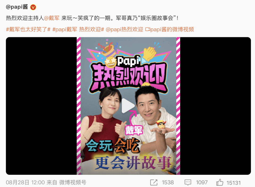 上个月底papi请戴军上自己的节目《热烈欢迎》,两人唠了36分钟,期间也带了不少货。