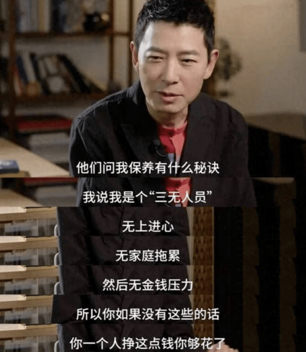 别人问他如何保养,他说他是「三无人员」:无上进心、无家庭拖累、无金钱压力,自然就没有什么好焦虑的。