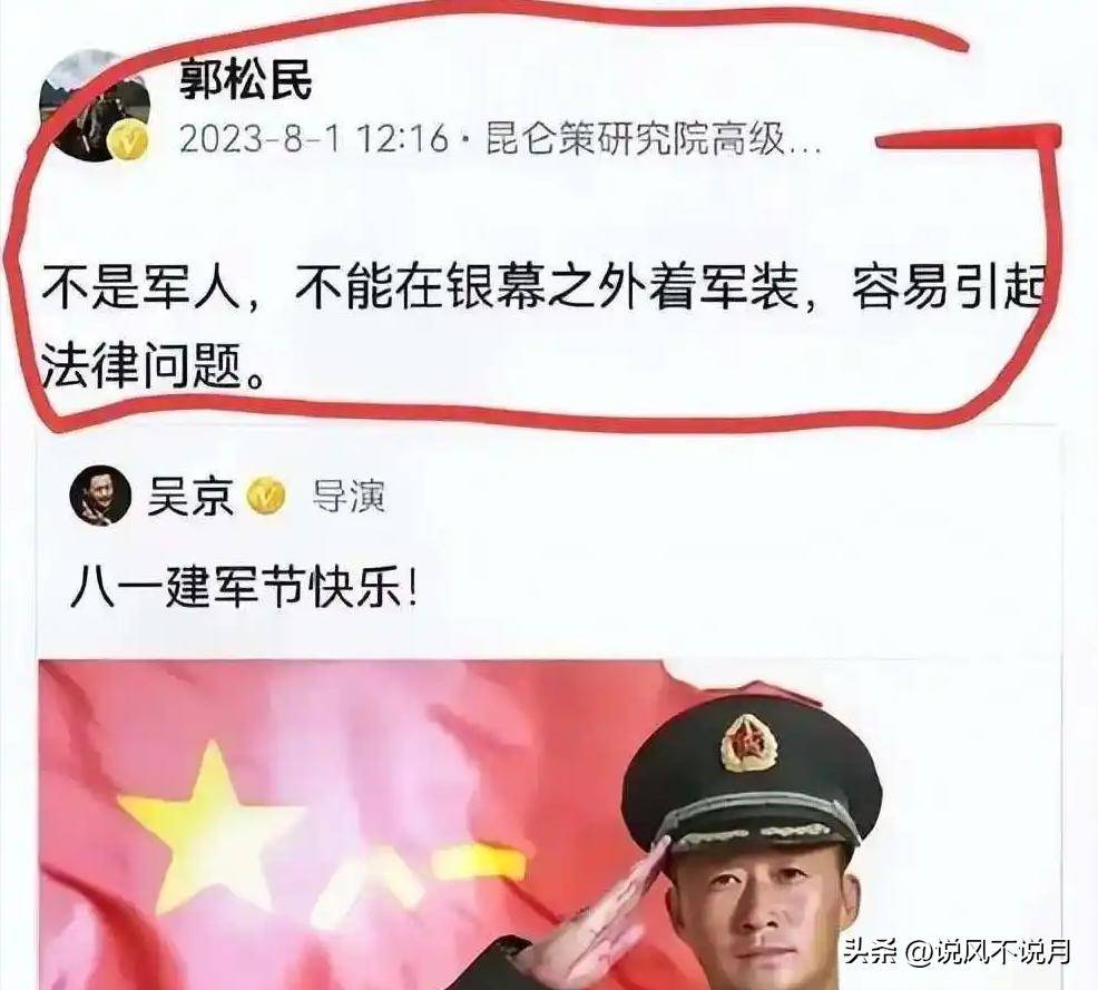但这个事情被郭松民看到了,直接点名吴京,不是军人,不能在银幕之外着军装,不然很容易引起法律的问题。