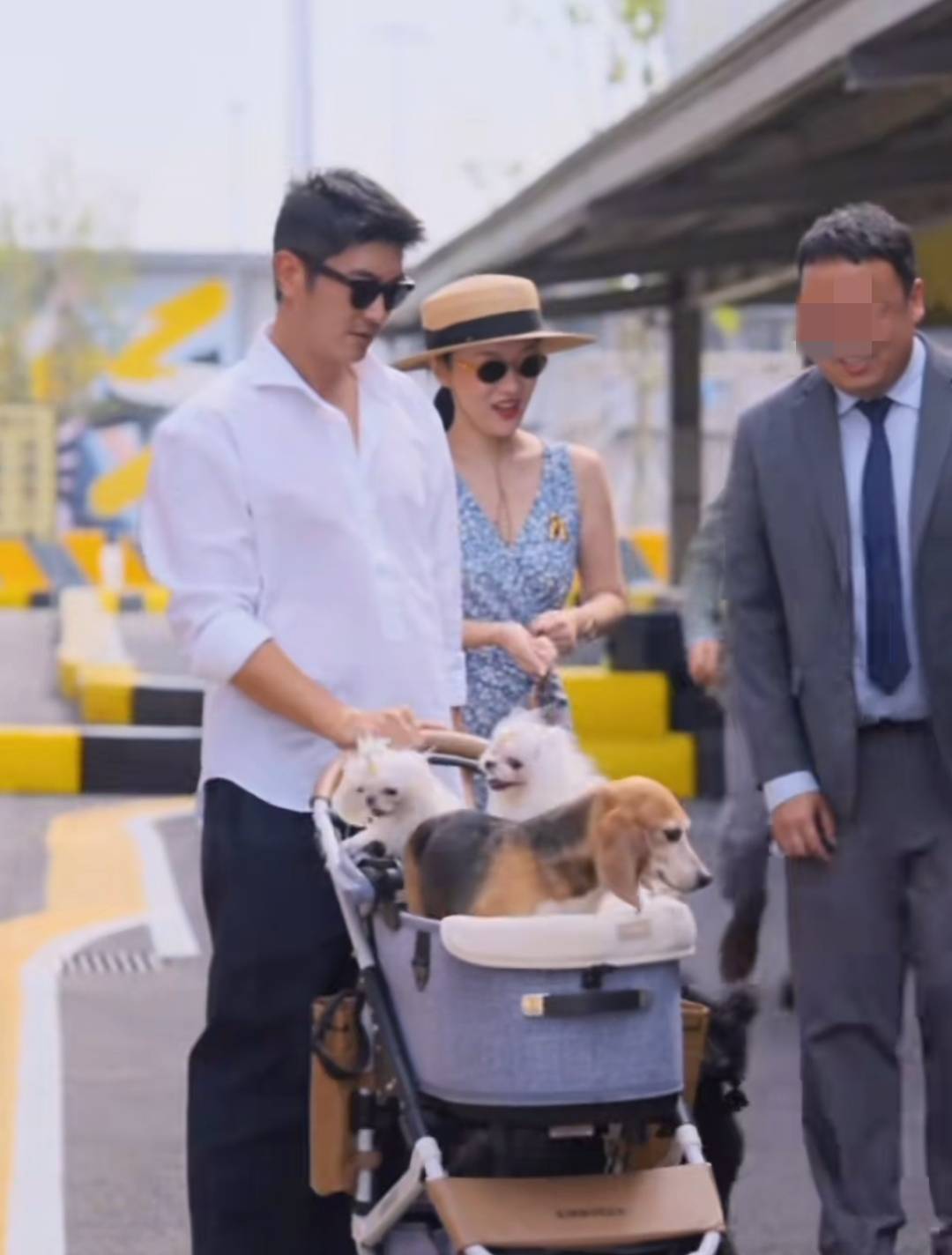 曝光画面中,杜江身穿白色衬衫,戴着墨镜,一手推着宠物推车,看着跟拍杂志一样,帅得不行。而一边的霍思燕则是牵着其他两条狗狗站在杜江身后,他们俩出行带着狗狗真是热闹。