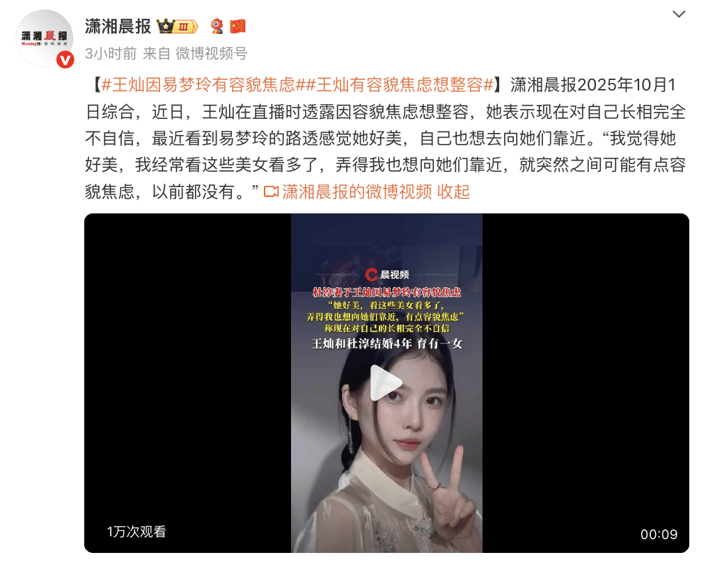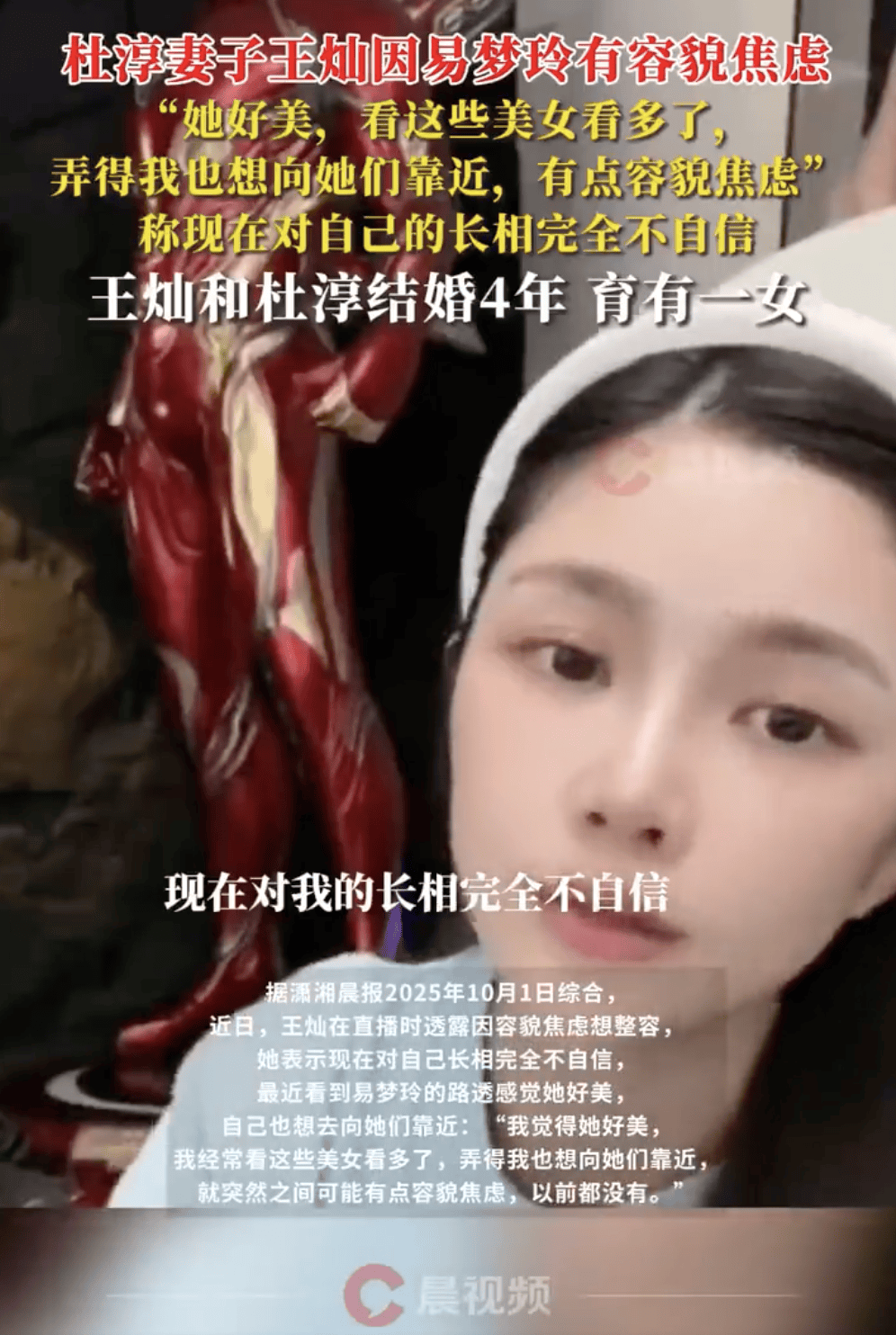 近日,王灿在直播时透露因容貌焦虑想整容,她表示现在对自己长相完全不自信,最近看到易梦玲的路透感觉她好美,自己也想去向她们靠近。