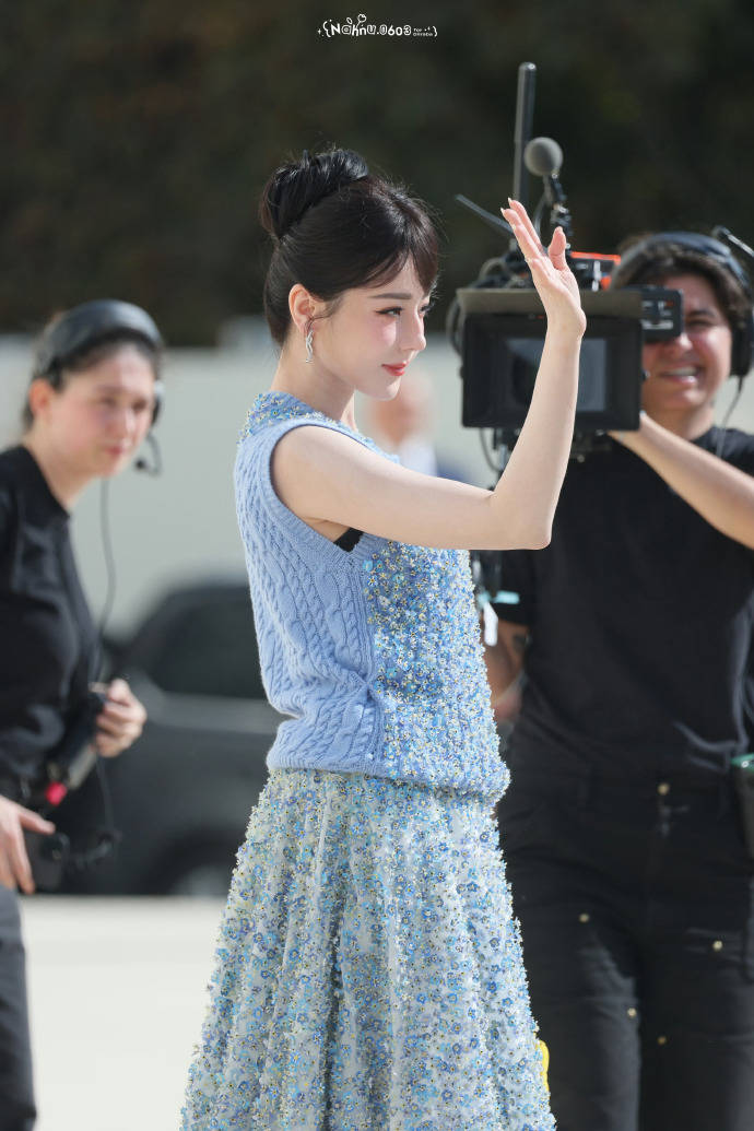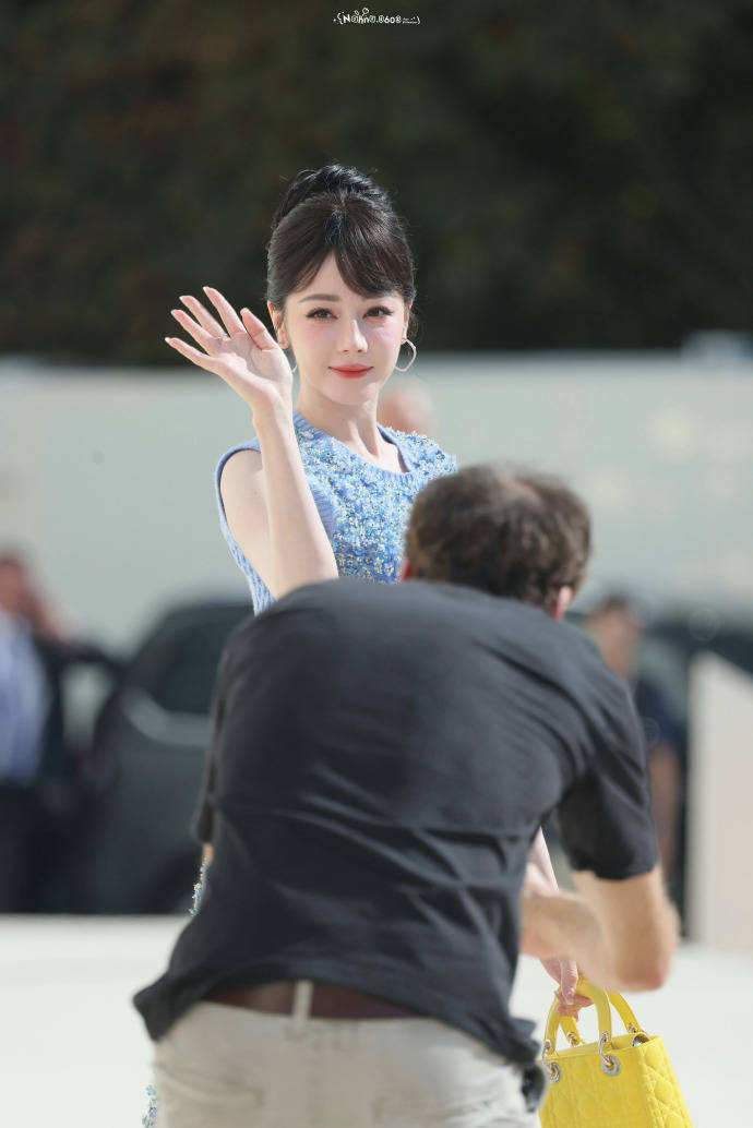 身为迪奥全球品牌大使,她这次可谓排面拉满:不仅身着特别定制款蓝色无袖花朵套裙,还享有国内艺人唯一的秀前试装特权。新创意总监Jonathan Anderson亲自为她量身打造,裙身布满立体刺绣花朵,不对称剪裁加重工珠绣,被外媒形容为“春日花园般的梦幻感”。
