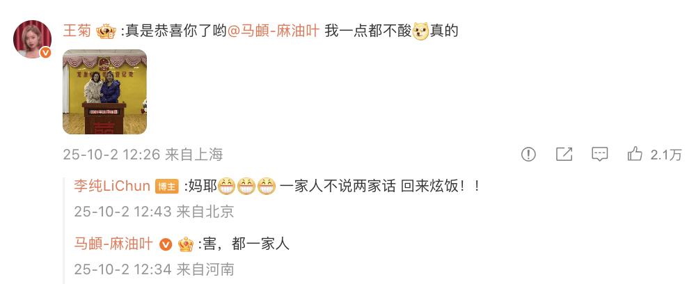 随后,李纯回复道:“妈耶,一家人不说两家话,回来炫饭!!”马頔也表示:“害,都一家人。”