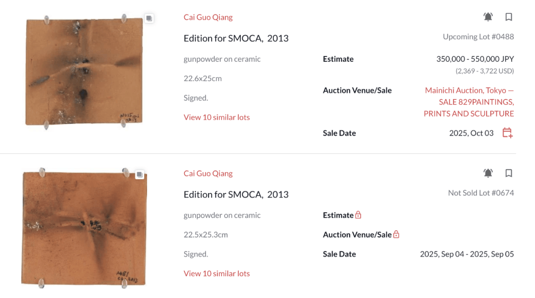 在2025年,蔡国强“流拍”和“低于预估价格”的作品,加起来已经超过一半以上了。