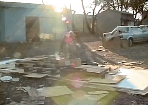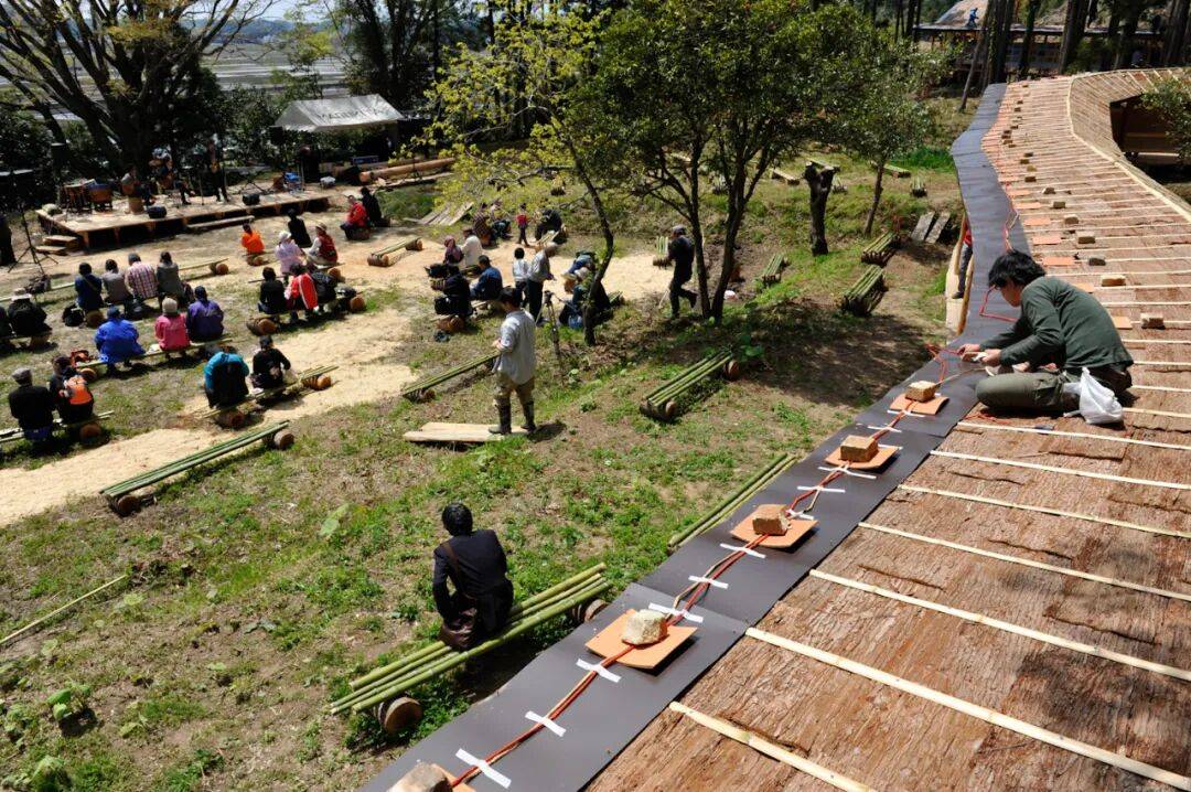 作品点燃之前,见近景:屋顶上被贴上雷管和火药的陶色瓦片。