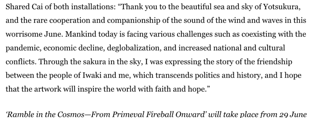 蔡国强在开展讲话中提出展望:“希望艺术品能激发世界的信念与希望。” 他同时提到了一些全球治理的共同问题,却很明显没有预料到这些话今后能反噬自身。