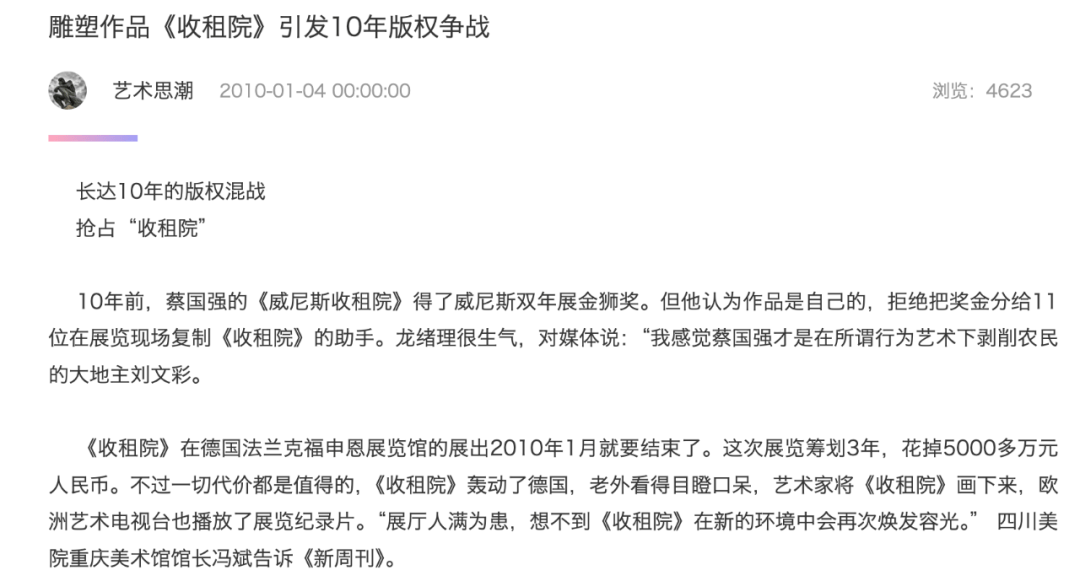 因最近的喜马拉雅“炸山”争议,本来已经没多少水花的《收租院》版权争议,又被挖出来,当作批判的材料。不少评论者认为,这件事证实了蔡国强的人品有问题。让网友愤怒的是,蔡国强居然拒绝分奖金给11位现场复制《收租院》的助手。